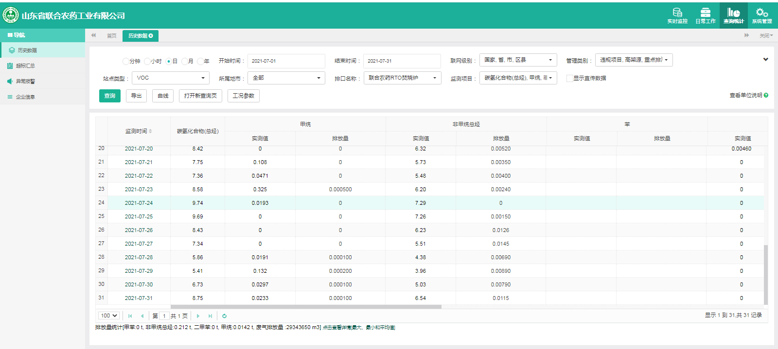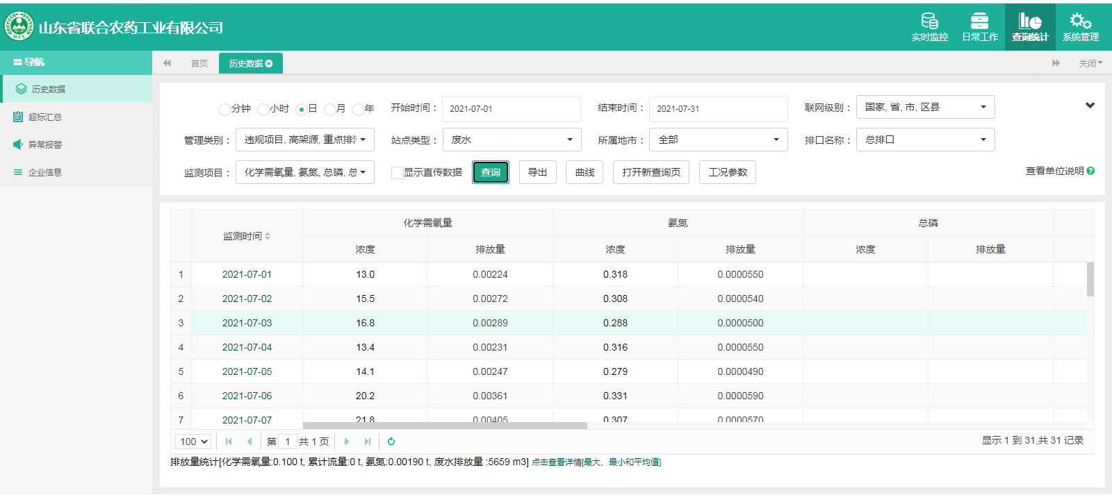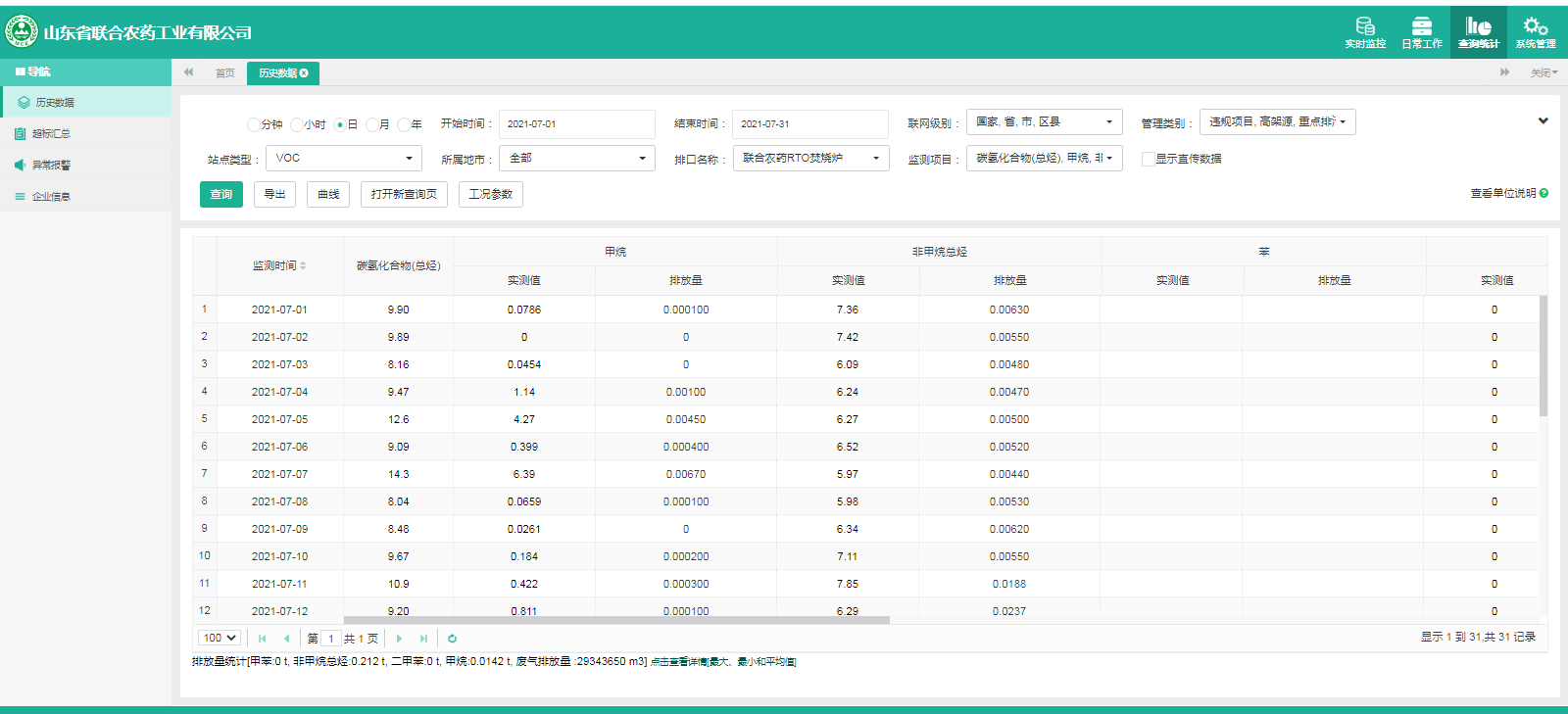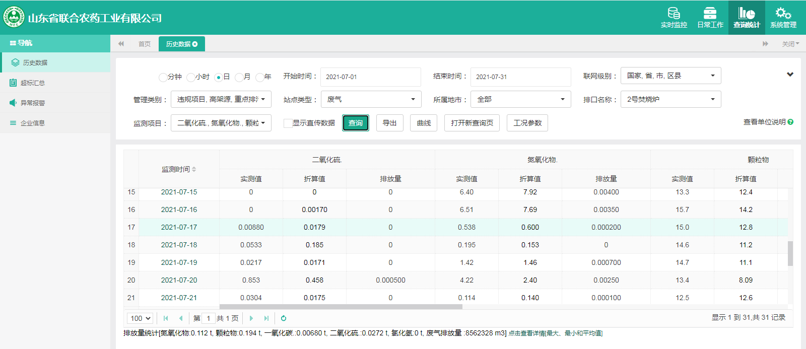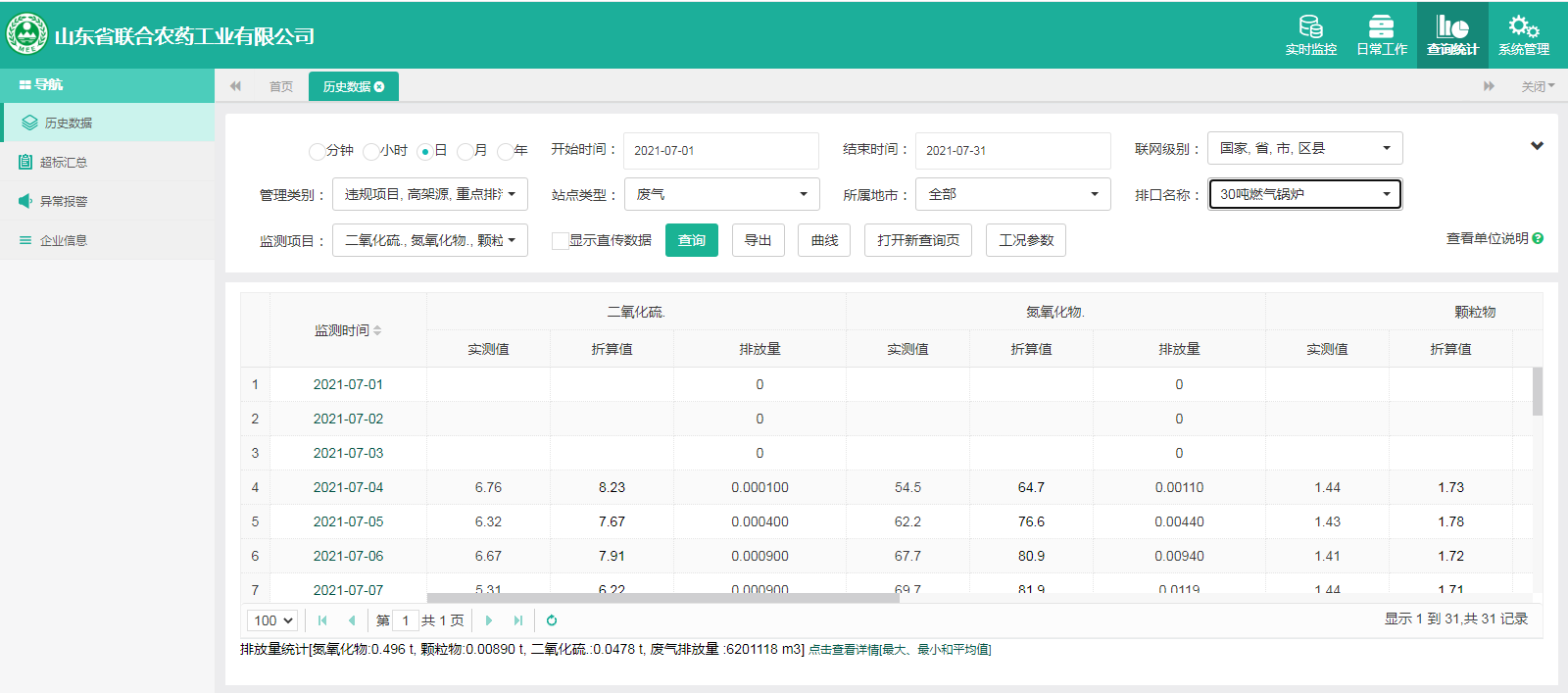 主要污染物包括COD、氨氮、二氧化硫,氮氧化物、烟尘、氯化氢、一氧化碳。其中废水中的COD、氨氮经厂区内污水处理设施处理达标排放,污水排放口污染因子COD、氨氮符合《流域水污染物综合排放标准 第1部分南四湖东平湖流域》(DB37/3416.1-2018)一般保护区标准,COD低于60mg/l,氨氮低于10mg/l。锅炉废气、导热油炉废气通过废气处理设施处理后经过烟囱高空排放,排放的烟气符合《山东省锅炉大气污染物综合排放标准(DB37/2374-2018)表2一般控制区及《区域性大气污染物综合排放标准》(GB37/2376-2019),SO2低于50 mg/m³,NOx低于200 mg/m³,烟尘低于10 mg/m³。焚烧炉废气通过废气处理设施处理后经过烟囱高空排放,排放的烟气符合《农药制造工业大气污染物排放标准》(GB39727-2020)表1、表2标准、《危险废物焚烧污染控制标准》(GB18484-2001)表3及《区域性大气污染物综合排放标准》(GB37/2376-2019)表2一般控制区标准,SO2低于100 mg/m³,NOx低于200 mg/m³,烟尘低于20 mg/m³,HCL低于60 mg/m³,一氧化碳低于80mg/m³。有组织废气排放符合《挥发性有机物排放标准 第6部分:有机化工行业》(DB37/2801.6-2018)表1标准,《农药制造工业大气污染物排放标准》(GB39727-2020)表1、表2标准、即甲醇低于50mg/m³,甲苯低于5mg/m³, VOCs低于60mg/m³。