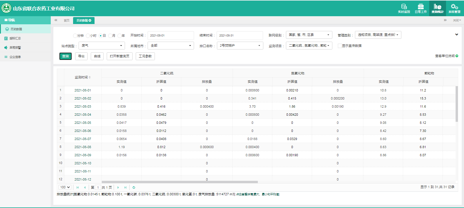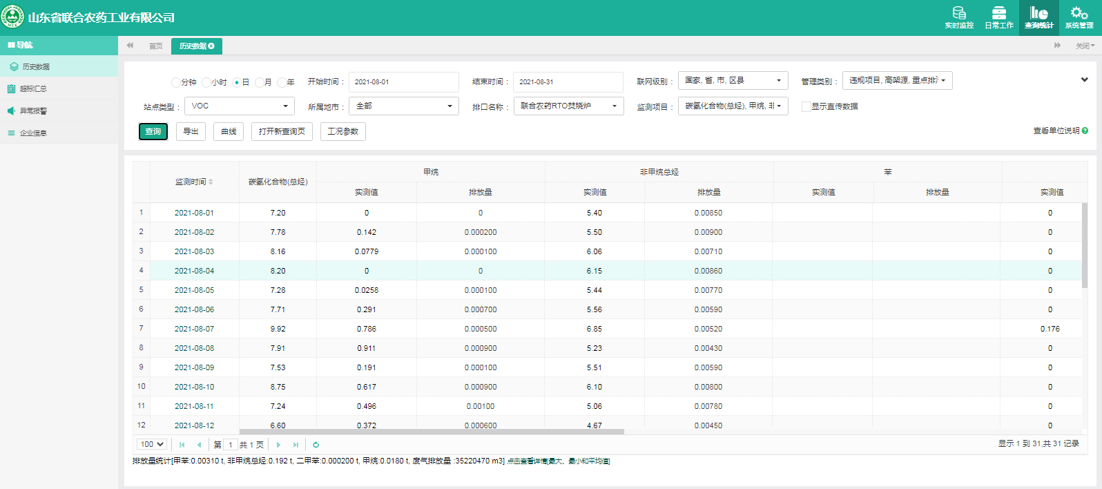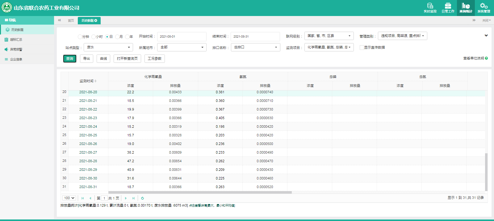 主要污染物包括COD、氨氮、二氧化硫,氮氧化物、烟尘、氯化氢、一氧化碳。其中废水中的COD、氨氮经厂区内污水处理设施处理达标排放,污水排放口污染因子COD、氨氮符合《流域水污染物综合排放标准 第1部分南四湖东平湖流域》(DB37/3416.1-2018)一般保护区标准,COD低于60mg/l,氨氮低于10mg/l。锅炉废气、导热油炉废气通过废气处理设施处理后经过烟囱高空排放,排放的烟气符合《山东省锅炉大气污染物综合排放标准(DB37/2374-2018)表2一般控制区及《区域性大气污染物综合排放标准》(GB37/2376-2019),SO2低于50 mg/m³,NOx低于200 mg/m³,烟尘低于10 mg/m³。焚烧炉废气通过废气处理设施处理后经过烟囱高空排放,排放的烟气符合《农药制造工业大气污染物排放标准》(GB39727-2020)表1、表2标准、《危险废物焚烧污染控制标准》(GB18484-2001)表3及《区域性大气污染物综合排放标准》(GB37/2376-2019)表2一般控制区标准,SO2低于100 mg/m³,NOx低于200 mg/m³,烟尘低于20 mg/m³,HCL低于60 mg/m³,一氧化碳低于80mg/m³。有组织废气排放符合《挥发性有机物排放标准 第6部分:有机化工行业》(DB37/2801.6-2018)表1标准,《农药制造工业大气污染物排放标准》(GB39727-2020)表1、表2标准、即甲醇低于50mg/m³,甲苯低于5mg/m³, VOCs低于60mg/m³。