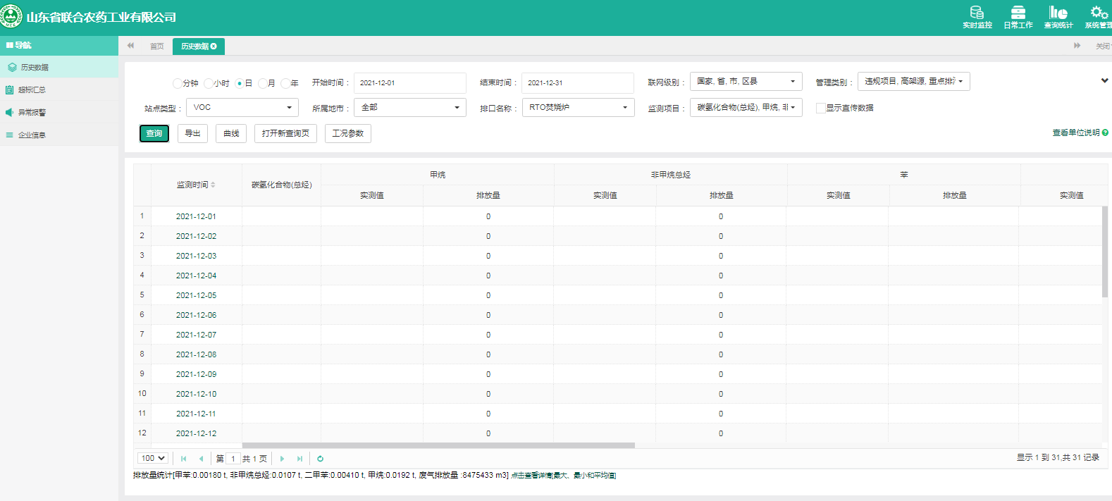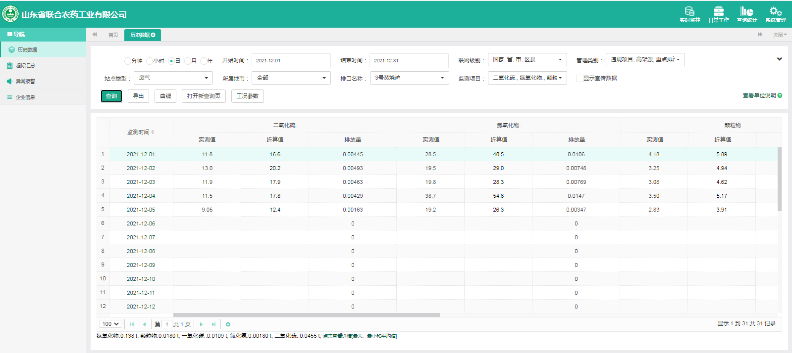 主要污染物包括COD、氨氮、二氧化硫,氮氧化物、烟尘、氯化氢、一氧化碳。其中废水中的COD、氨氮经厂区内污水处理设施处理达标排放,污水排放口污染因子COD、氨氮符合《流域水污染物综合排放标准 第1部分南四湖东平湖流域》(DB37/3416.1-2018)一般保护区标准,COD低于60mg/l,氨氮低于10mg/l。锅炉废气、导热油炉废气通过废气处理设施处理后经过烟囱高空排放,排放的烟气符合《山东省锅炉大气污染物综合排放标准(DB37/2374-2018)表2一般控制区及《区域性大气污染物综合排放标准》(GB37/2376-2019),SO2低于50 mg/m³,NOx低于200 mg/m³,烟尘低于10 mg/m³。焚烧炉废气通过废气处理设施处理后经过烟囱高空排放,排放的烟气符合《农药制造工业大气污染物排放标准》(GB39727-2020)表1、表2标准、《危险废物焚烧污染控制标准》(GB18484-2001)表3及《区域性大气污染物综合排放标准》(GB37/2376-2019)表2一般控制区标准,SO2低于100 mg/m³,NOx低于200 mg/m³,烟尘低于20 mg/m³,HCL低于60 mg/m³,一氧化碳低于80mg/m³。有组织废气排放符合《挥发性有机物排放标准 第6部分:有机化工行业》(DB37/2801.6-2018)表1标准,《农药制造工业大气污染物排放标准》(GB39727-2020)表1、表2标准、即甲醇低于50mg/m³,甲苯低于5mg/m³, VOCs低于60mg/m³。
